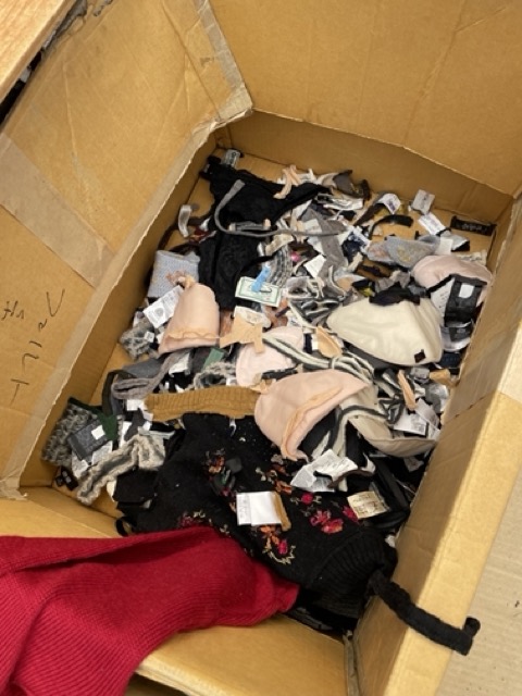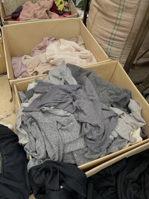工場の中には、ベールの状態(白い布で包んだ塊)の古着と、付属を取り除き色ごとに仕分けた古着のボックスがいくつもありました。