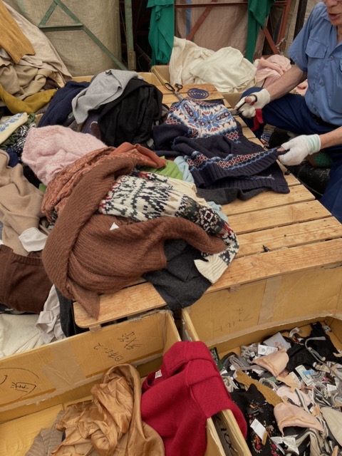 奥の作業スペースでは、ウール混率の高いものを見極め、色が混ざっている柄の部分やタグ、付属(ボタンなどの装飾)などを一着一着取り除いて仕分けていく様子を見せてくださいました。